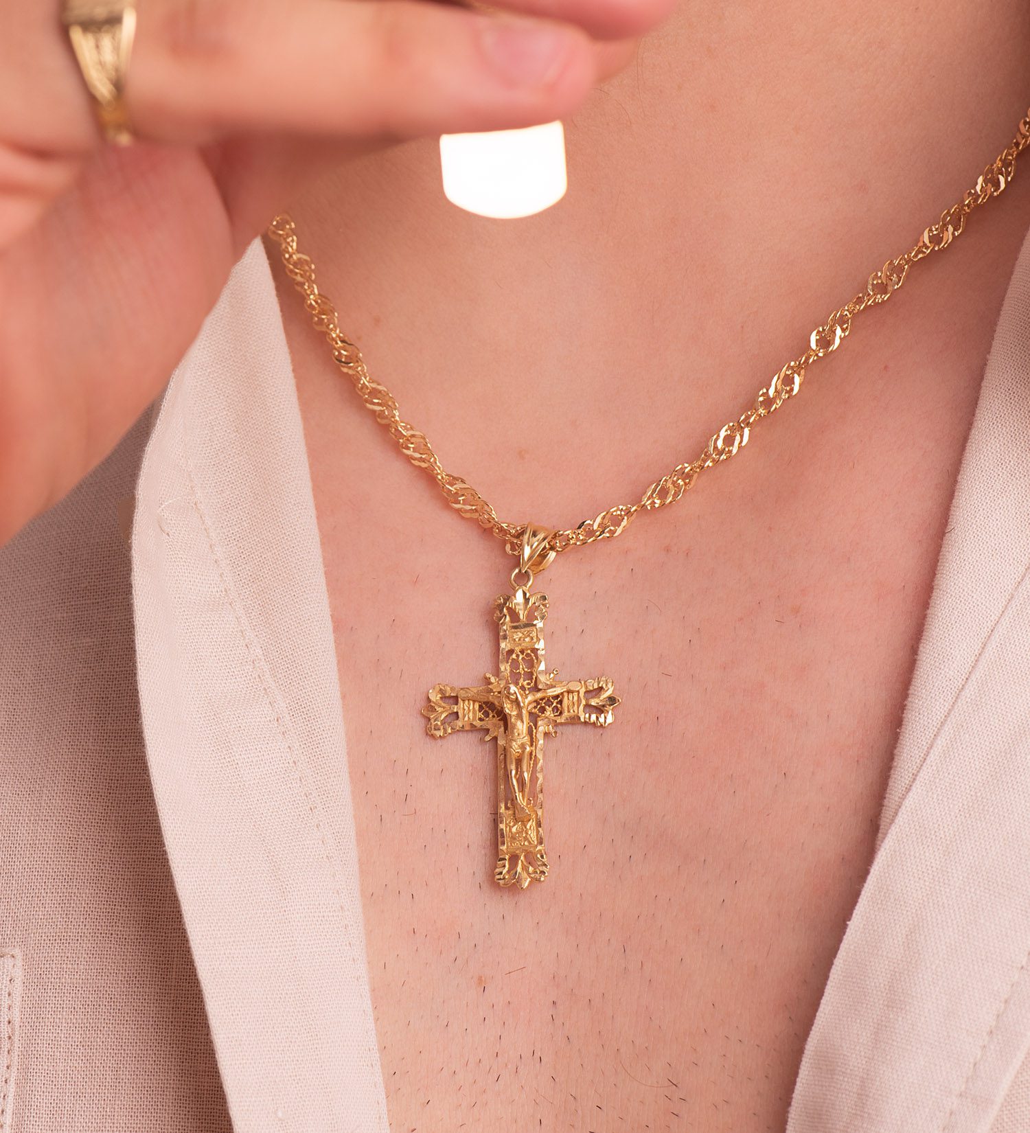 18K CRUZ ORO AMARILLO FILIGRANA CON CRISTO TALLADA 42X27 MM