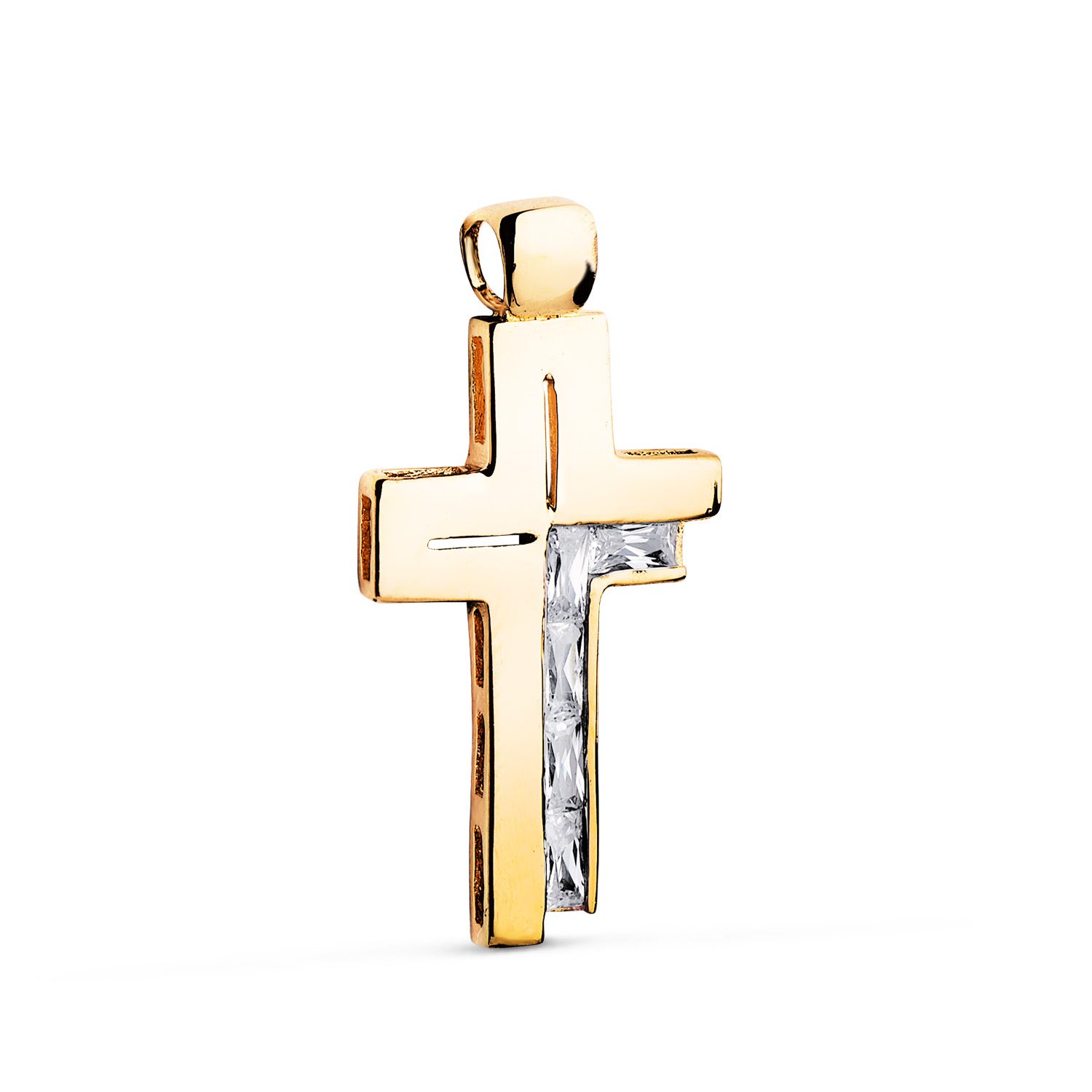 18K CRUZ ORO AMARILLO PIEDRAS BAGUETTE CIRCONITAS BLANCAS. 31 X 15 MM