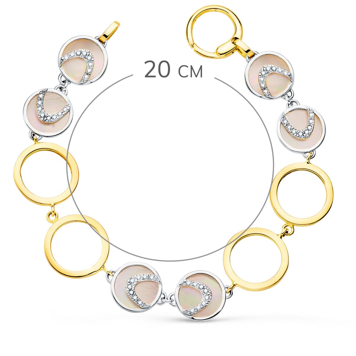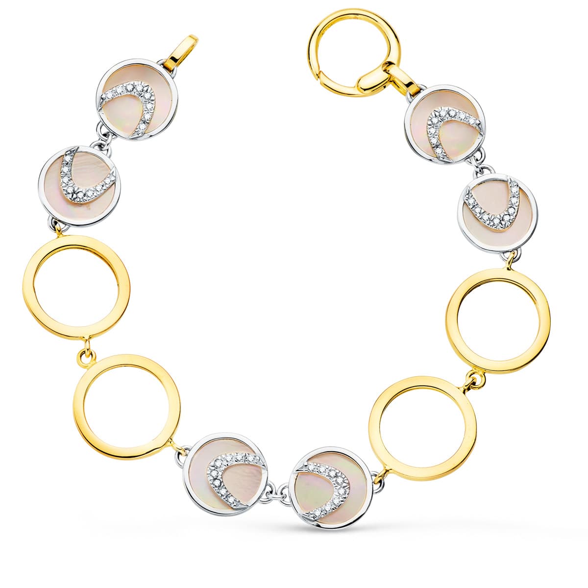 18K PULSERA ORO BICOLOR CIRCULOS CALADOS 16 MM Y NACAR ROSA 20CM